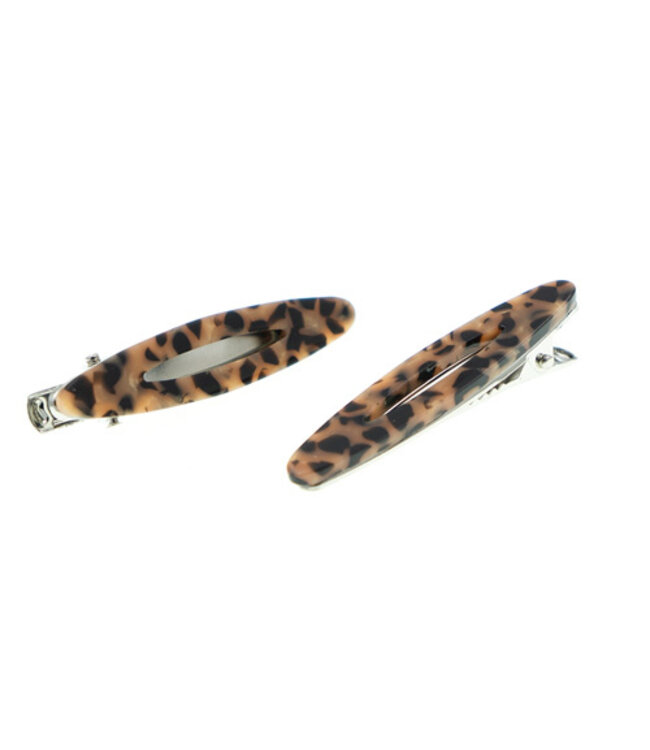Set van twee leuke alligator haarclips, bruin gevlekt. Tussen duim en wijsvinger, klem je ze gemakkelijk open en dicht. Aan de binnenzijde van deze zilverkleurige haarclips, zitten kleine tandjes. Deze geven extra grip in je haar, zodat deze goed blijven zitten in je haar. Verwerk je deze haarclips in je opgestoken haar of los haar? Gebruik je er 1 of 2 tegelijk? De keus is uiteraard aan jou. Deze haarclips maken subtiel je outfit compleet!