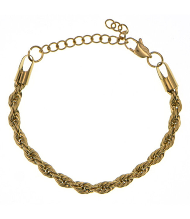 Prachtige goudkleurige gedraaide armband. Door de draaiing ziet deze armband er sierlijk uit. Het materiaal waar deze armband van is gemaakt is RVS, roestvrij staal. Dit materiaal staat bekend om zijn duurzaamheid. RVS de naam zegt het al, roest niet, verkleurt niet en is huidvriendelijkheid. Deze armband is verstelbaar en draagt daardoor comfortabel.