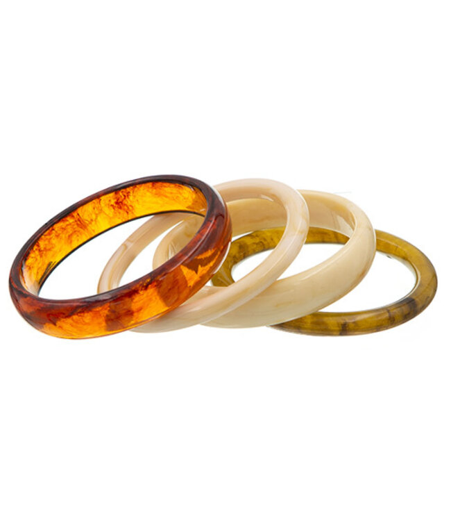 Mooie set armbanden in natuurlijke kleuren. Twee van de vier armbanden zijn semi transparant. Doordat deze armbanden van kunststof zijn gemaakt, zijn ze licht qua gewicht. Ga jij deze armbanden dragen als set of ga je elke dag voor een andere armband om je pols? Door de materiaalkeuze zijn deze armbanden onderhoudsvriendelijk. Want poetsen is niet nodig en water is geen probleem. Ideaal dus!