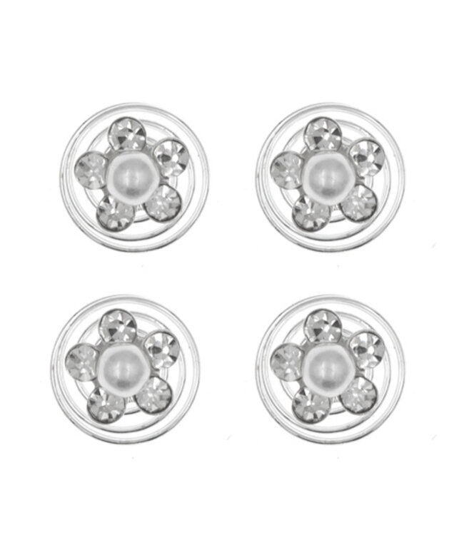 Deze zilverkleurige curlies zijn voorzien van een prachtige bloem. Het midden van de bloem is een crèmekleurige parel. Met daar omheen vijf kleine transparante strass steentjes. De strass steentjes geven een mooie glinstering aan je haarstijl. Draai deze curlies gemakkelijk in en uit opgestoken haar. Draag ze in je haar tijdens een feestje of bruiloft en maak je look compleet!