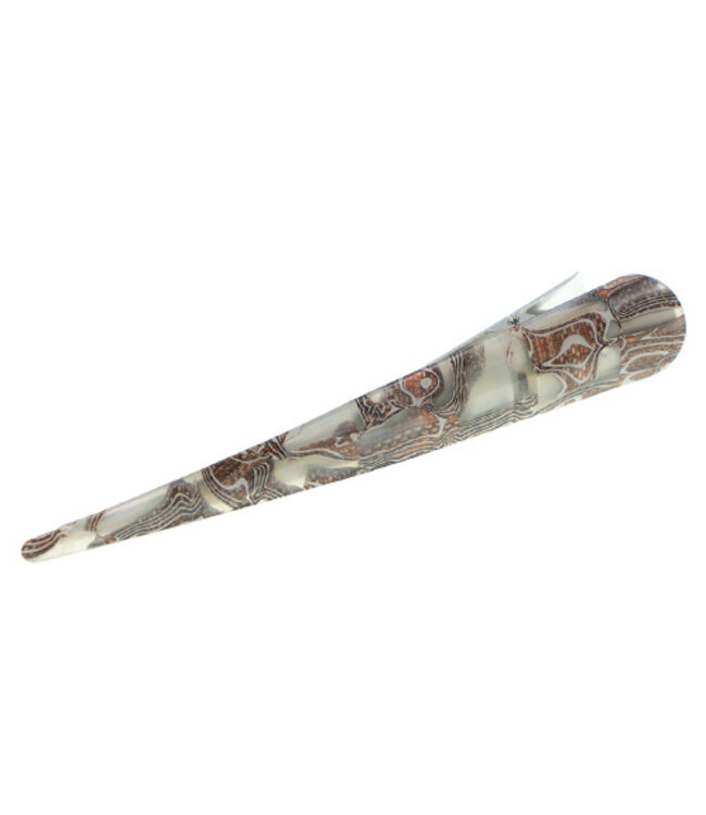 Hoe zou jij deze prachtige zilverkleurige duckklem omschrijven? Deze groot formaat duckklem heeft unieke patronen aan de bovenzijde, in bruine en parelmoerachtige tinten. Werkelijk elke duckklem is hierdoor uniek. De duckklem die je ontvangt zal dus niet exact hetzelfde patroon hebben als op de foto. Aan de binnenzijde van deze duckklem zitten mini tandjes, deze geven een goede grip aan je haar. Door het gebruik van metaal, is deze duckklem extra stevig en gaat daardoor lang mee!