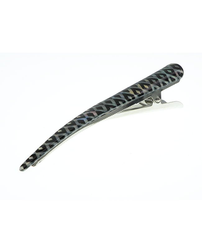 Prachtige zilverkleurige duckklem met zwart/wit patroon met ruiten erop. Deze duckklem heeft een groot formaat maar is licht in gewicht en draagt daardoor comfortabel. De witte ruit hebben een mooie subtiele parelmoer glans wanneer het licht erop valt. Deze duckklem is gemakkelijk tussen duim en wijsvinger te openen en sluiten. Aan de binnenzijde zitten kleine ‘tandjes’ waardoor deze een goede grip heeft in je haar. Hoe draag jij deze duckklem in je haar? Afhankelijk van je haarlengte en haardikte, kun je je haar helemaal of gedeeltelijk vastzetten.
