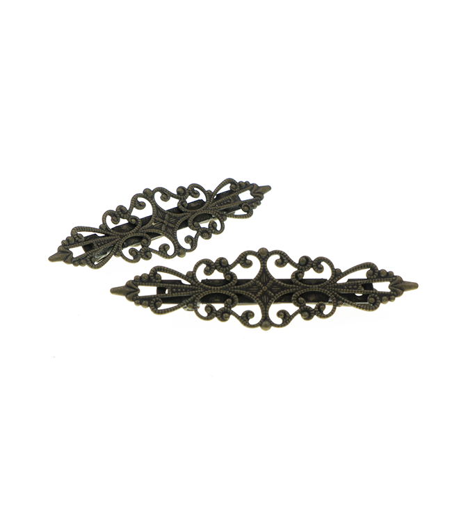 Set van twee prachtige bronskleurige haarclips. De haarclip is voorzien van een sierlijk, klassiek, opengewerkt ornament. Waardoor het haar mooi zichtbaar is. De haarclip kan geopend en gesloten worden tussen duim en wijsvinger. Draag je er 1 of beide in je haar? Helemaal leuk om in een opgestoken haarstijl te verwerken, blijft door de sluiting stevig in het haar zitten. Deze haarclip is stevig maar ook licht qua gewicht dus draagt comfortabel. Door kleur en vormgeving doet deze haarclip je denken aan vroegere tijden.
