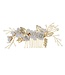 Prachtige goudkleurige haarkam met witte bloemen. Verder is deze haarkam bewerkt met goudkleurige bloemblaadjes, parels en kraaltjes. Schuif deze haarkam gemakkelijk in los of opgestoken haar om je look compleet te maken. Deze haarkam is werkelijk een juweeltje in iedere haarstijl!