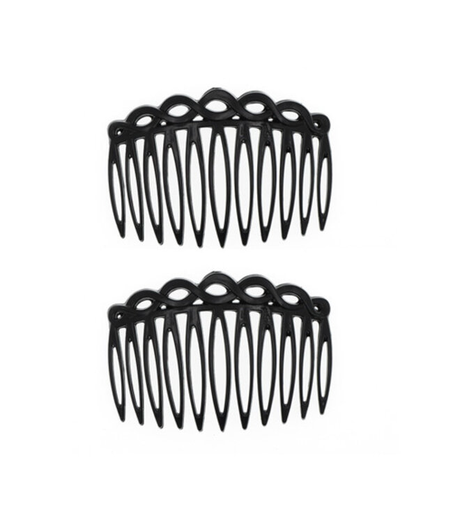 Set van twee sierlijke zwarte haarkammen. Deze haarkammen hebben een mooi klein formaat. Daardoor zijn ze gemakkelijk in zowel los als opgestoken haar te verwerken. Doordat deze haarkammen gemaakt zijn van kunststof, zijn ze licht qua gewicht en dragen comfortabel. Door het sierlijke lijnenwerk aan de bovenzijde, is je haar zichtbaar.