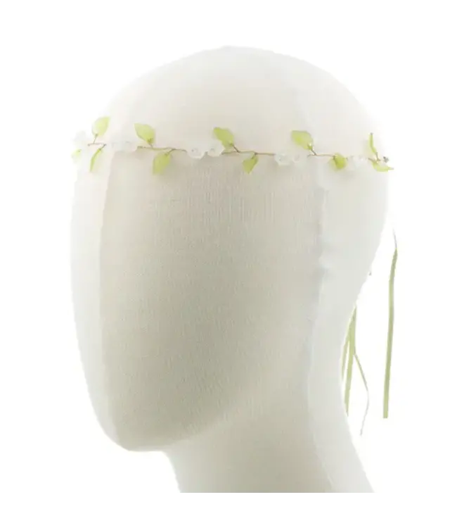 - Kleur: goudkleurige haarketting, mat witten bloempjes met een transparant kraaltje in het midden, groene blaadjes en groen lint.
