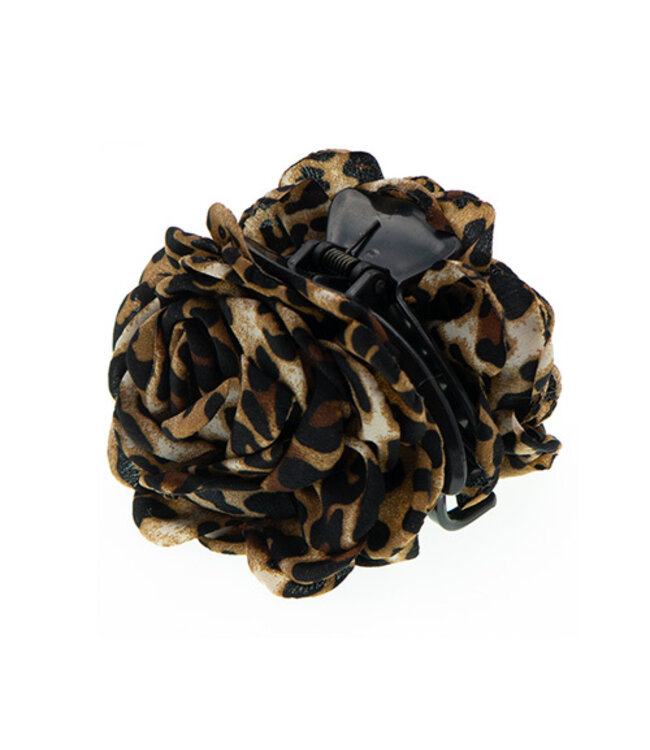 Met deze stevige haarklem zet je je haar in een handomdraai vast. De mooie trendy panterprint laat je haarstijl er gelijk feestelijk uitzien. Door de gebruikte stof heeft de bloem een mooi volume. De kleuren van de bloem zijn gemakkelijk te combineren met effen kleuren kleding in natuurlijke tinten zoals bruin, beige en zwart.