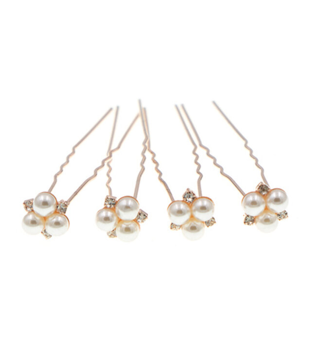 Set van vier prachtige goudkleurige haarpinnen. Elke haarpin is voorzien van drie crèmekleurige pareltjes. Met daar omheen drie kleine transparante strass steentjes. De strass steentjes geven net die subtiele glinstering in je haar, waar je naar op zoek was. Deze set zal geweldig staan in een knot of opgestoken haar. Steek ze gemakkelijk in het haar en haal ze er net zo gemakkelijk weer uit!