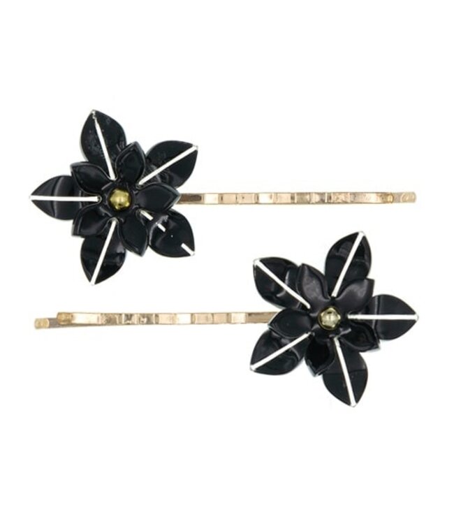 Set van twee goudkleurige haarschuifjes met mooie zwarte bloem erop. Schuif deze stevige haarschuifjes gemakkelijk in los of opgestoken haar. Door het kleurgebruik een goede match bij iedere outfit!