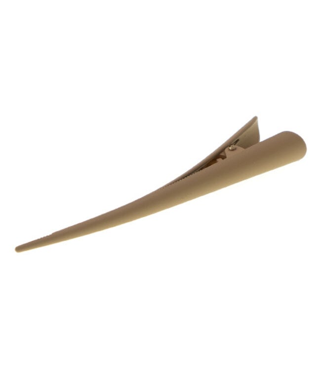 Lichtbruine duckklem in basic vormgeving met een matte afwerking. Deze duckklem is bijna volledig van kunststof gemaakt. Waardoor deze licht is in gewicht en daardoor comfortabel in het haar draagt. Aan de binnenzijde van deze duckklem zitten kleine tandjes, deze houden je haar extra goed op z’n plek. Door de effen kleur van deze duckklem, kun je deze gemakkelijk combineren met kleding met drukke patronen, ideaal dus!