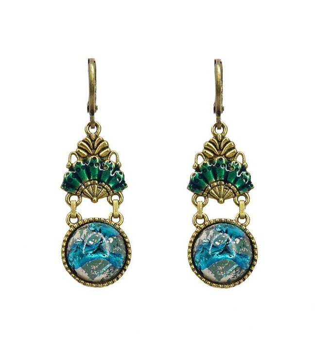 - Materiaal: de basis is gecoat messing. De waaier is ingelegd met vintage steentjes van aqua en zilver gemêleerd glas. Het oorhaakje is van (nikkelvrij) verguld messing.